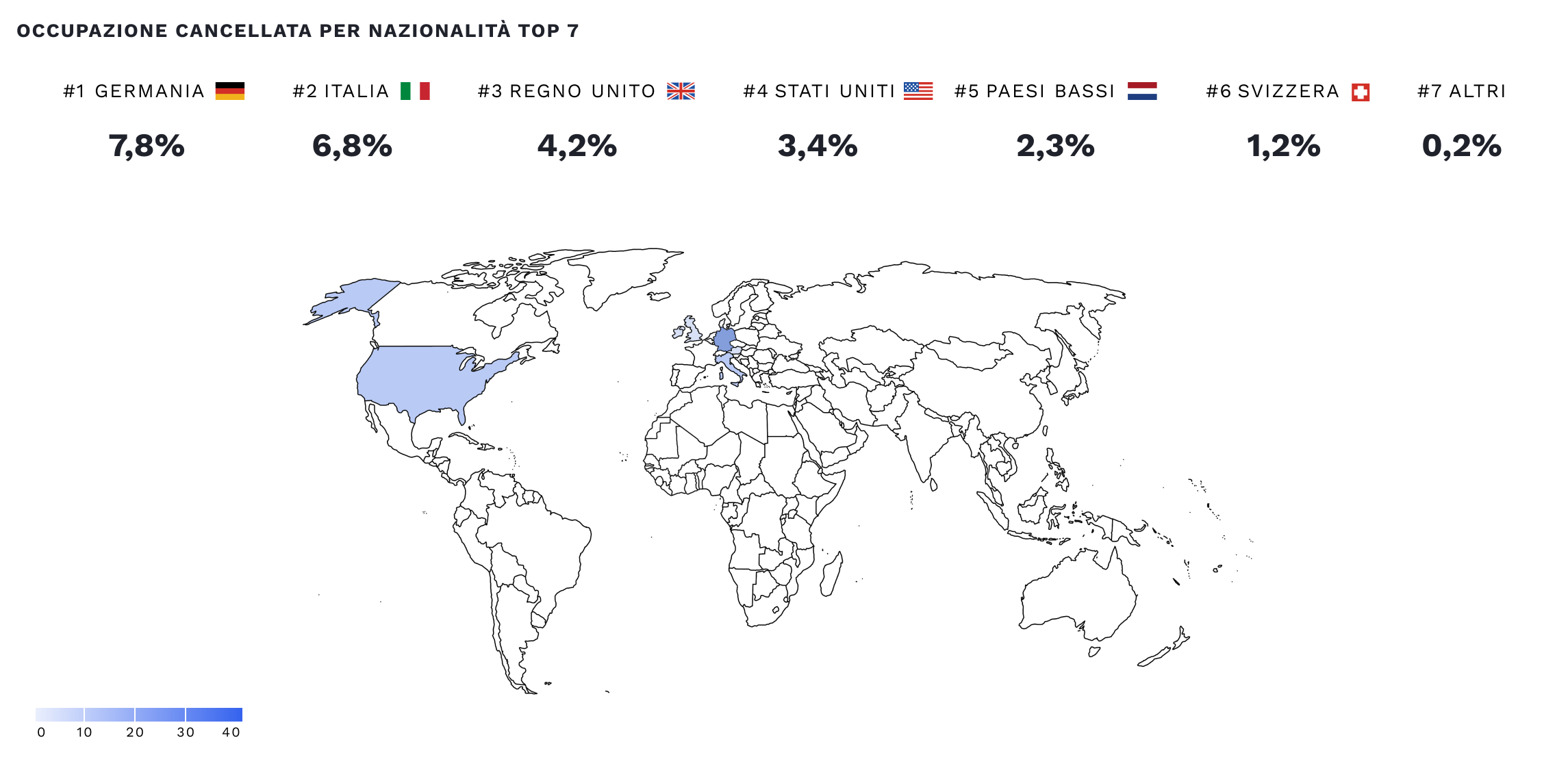 Display the percentage of cancelled occupancy in your destination by the nationality of tourists who have stayed in past and future periods.