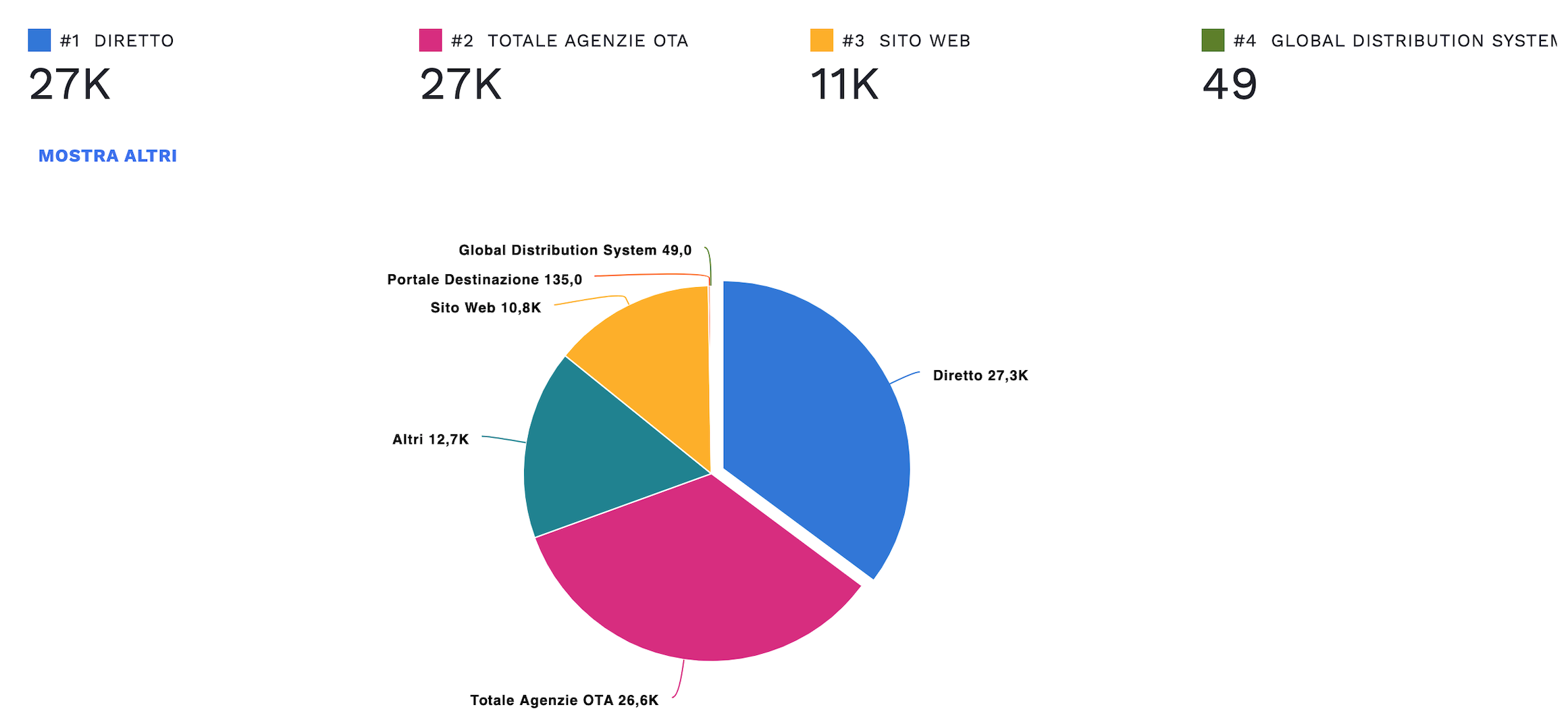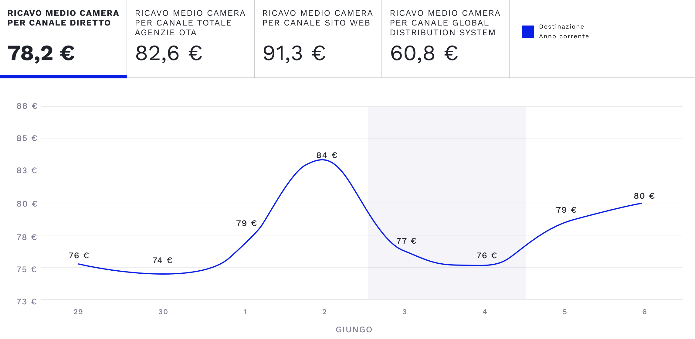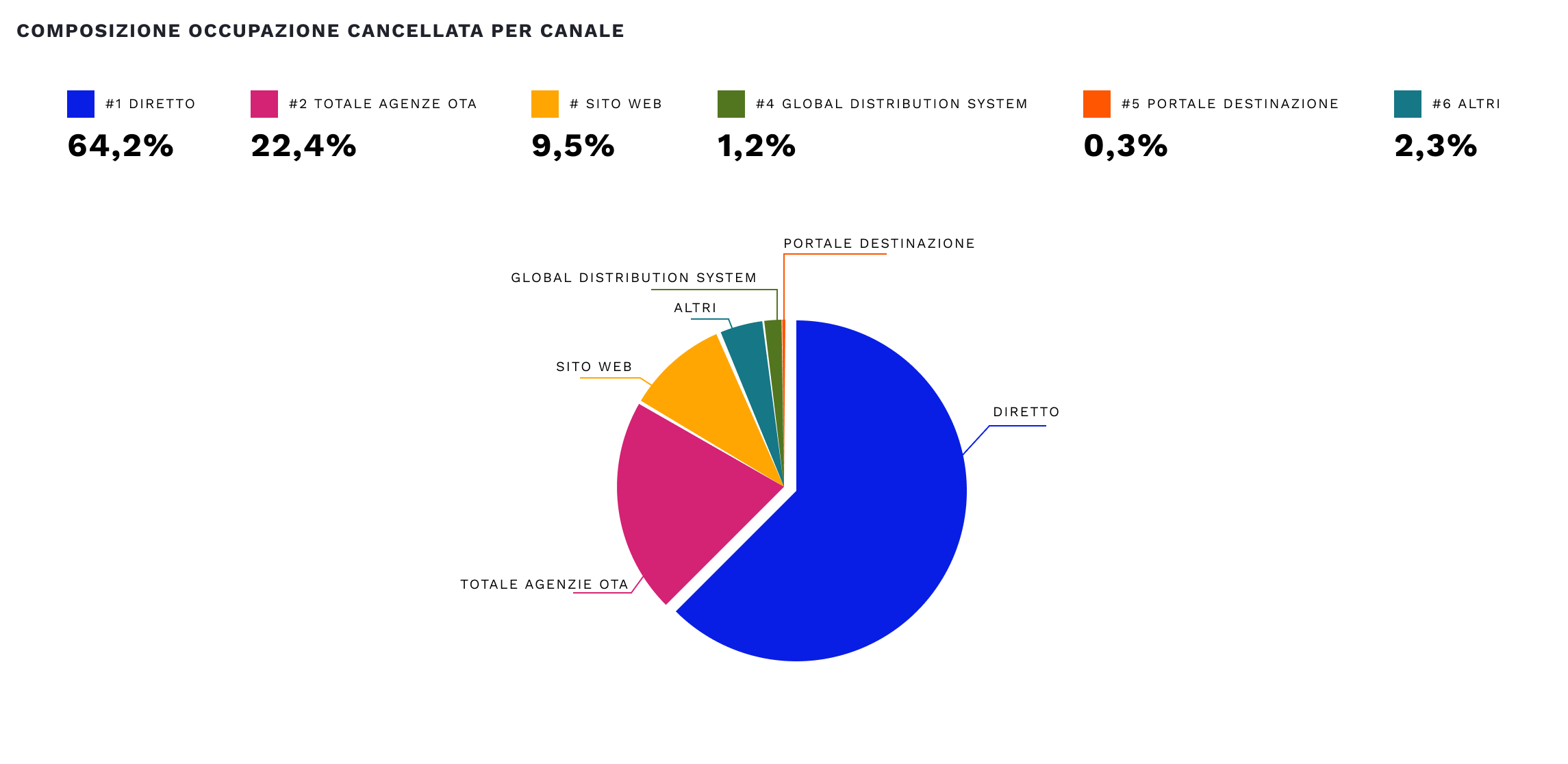 You can segment occupancy by sales channel and monitor the sales percentages on OTAs, GDS, direct online channels, such as the website, or direct offline channels, such as telephone, recorded in your territory for a past or future period.