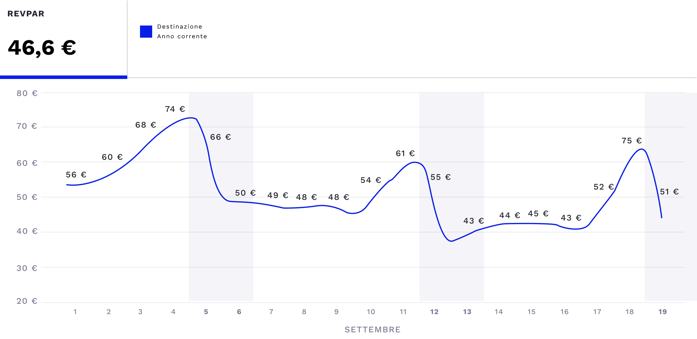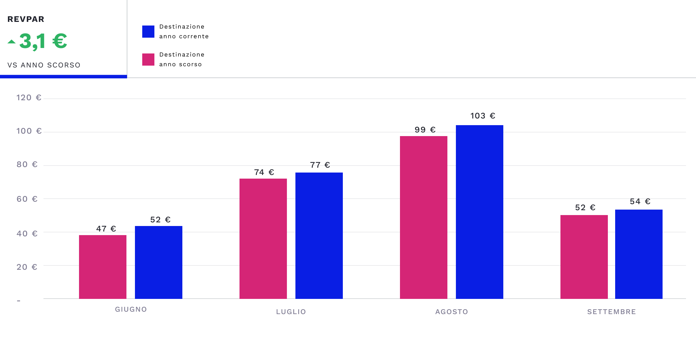 RevPAR represents the average revenue per available room and expresses the ratio between total room revenue and the accommodation's occupancy capacity. It is calculated as the ratio between room revenue (excluding meal components) and the available rooms. Through this indicator, it is possible to measure the economic growth of your destination.