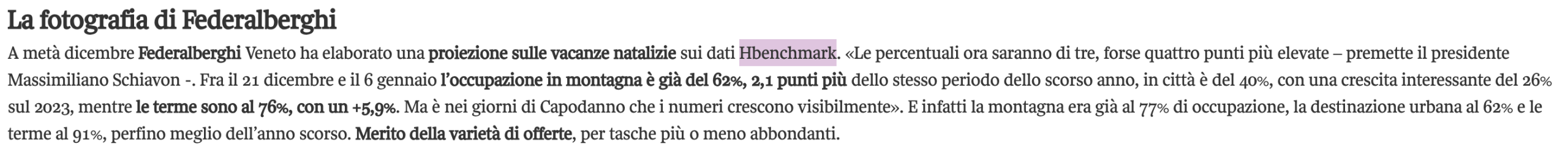 Christmas holidays in Veneto are achieving excellent results, as shown by the HBenchmark data from mid-December 2024: the spas are almost fully booked and the mountains are already approaching full capacity.