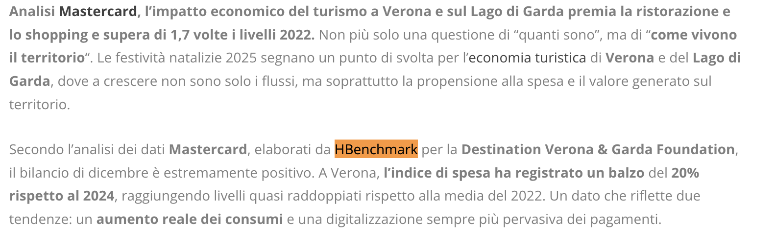 In Verona, tourism generates not only visitor numbers, but a widespread and growing value across the entire territory, involving local catering, commerce and services. This is reported by the article published on The Adige, based on Mastercard Data processed by HBenchmark for the Verona & Garda Foundation, referring to the 2025 Christmas holiday period (month of December).
