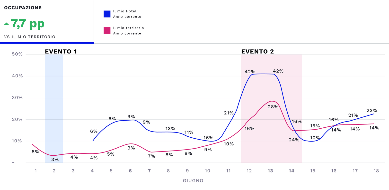 È possibile monitorare la correlazione occupazione, prezzi medi, ricavi complessivi registrati nella propria struttura durante un evento, confrontando questi valori con un gruppo di competitor o con la destinazione.