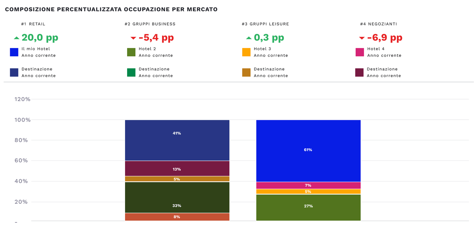 Puoi dividere la percentuale di occupazione cancellata per tipologia di mercato (retail, negoziati, gruppi leisure e gruppi business) e confrontarla con quella del territorio o competitive set, per un periodo o un evento specifico passato futuro