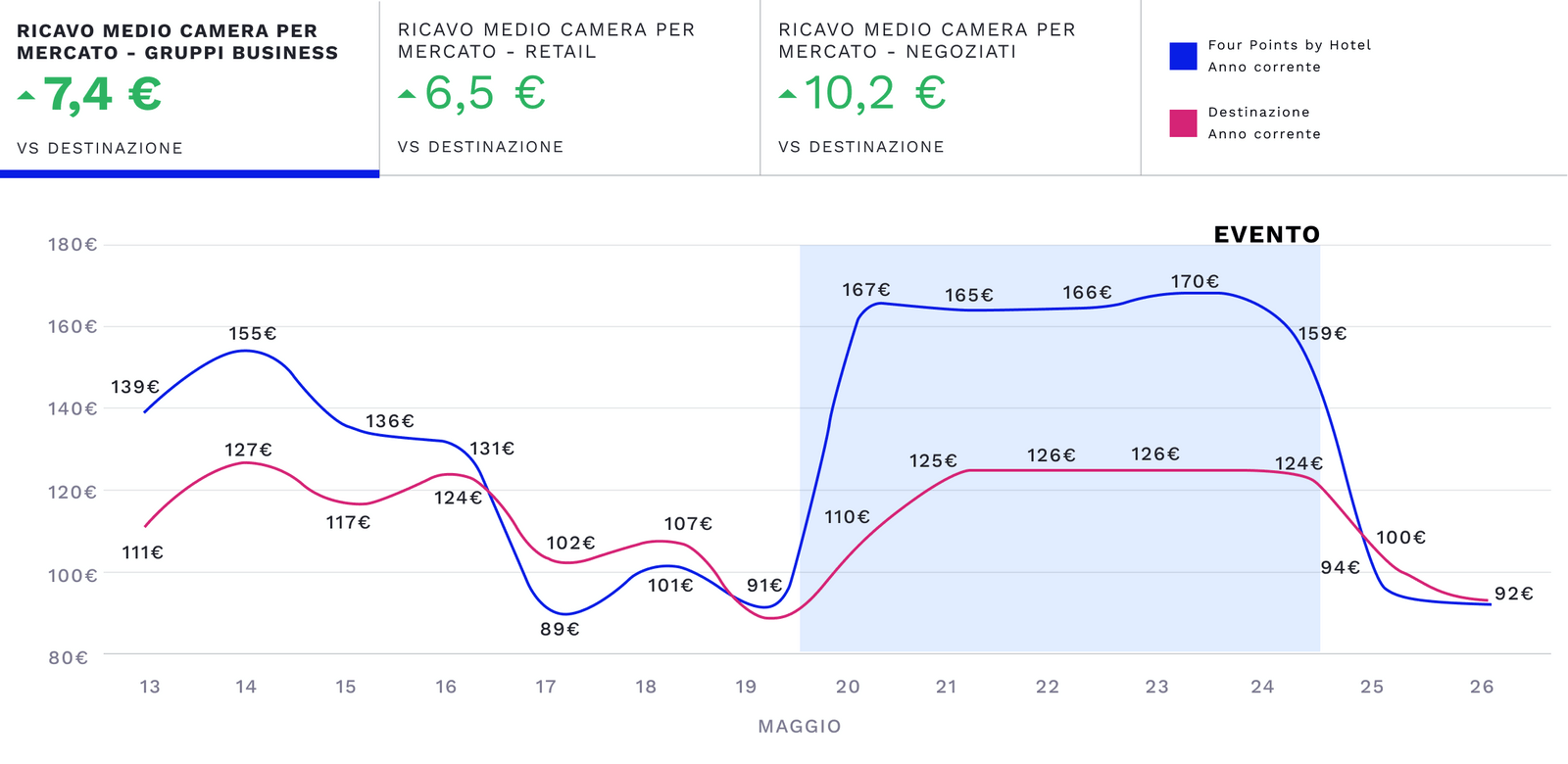 Puoi comparare il ricavo medio per tipologia di mercato (retail, gruppi business, gruppi leisure e negoziati) con quella della tua destinazione o gruppo di competitor, per un periodo specifico passato o futuro.