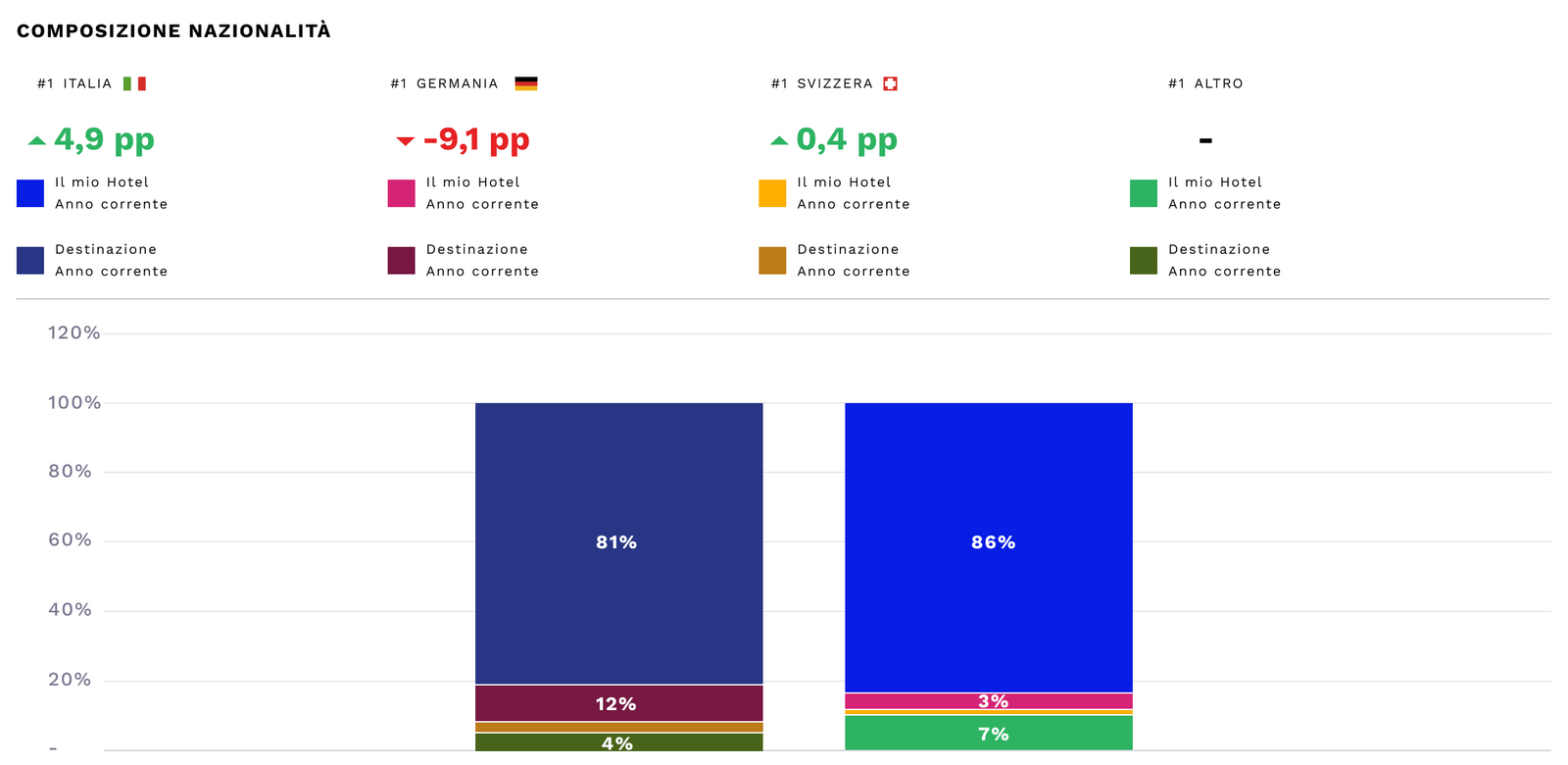 Puoi approfondire per singole nazionalità degli ospiti e capire il mix di presenze nel tuo hotel rispetto al tuo territorio o competitive set per un periodo specifico passato o futuro.