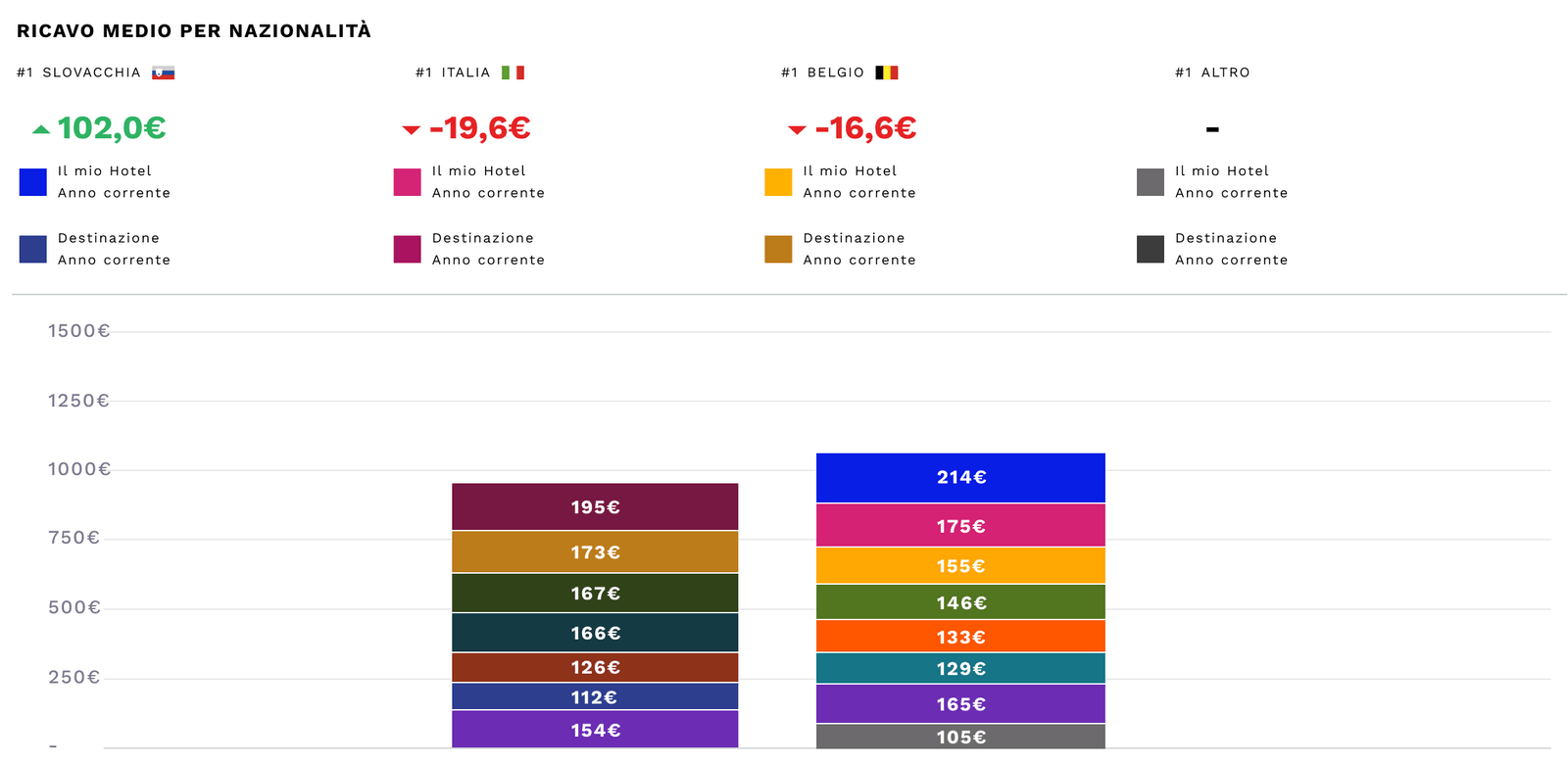 È possibile monitorare le nazionalità degli ospiti per capire l’andamento dei prezzi medi per nazionalità e il mix presenze nel tuo hotel rispetto al tuo territorio o competitive set per un periodo specifico passato o futuro.