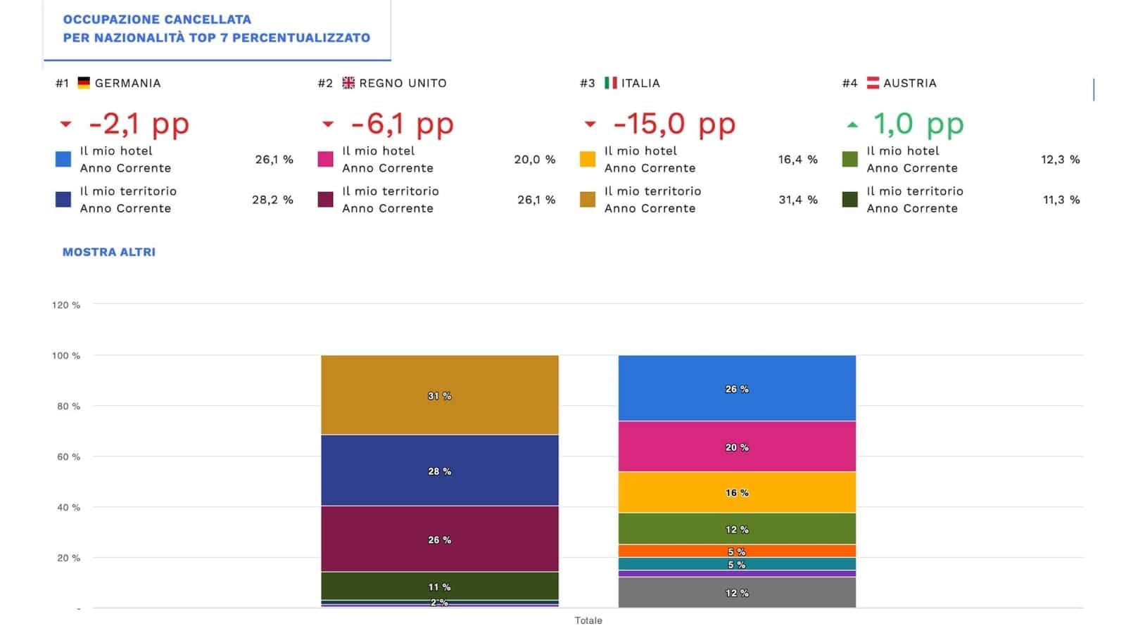 Puoi fare un confronto tra percentuale di occupazione cancellata per nazionalità del tuo hotel rispetto a quella del territorio o competitive set, per un periodo o un evento specifico passato e futuro.