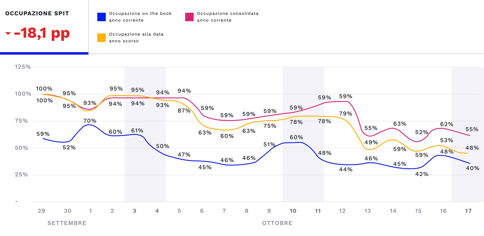 Le tre linee che appaiono nei grafici SPIT presentano 3 colori differenti: blu, giallo e magenta. La linea blu rappresenta l’occupazione on the book, le prenotazioni ricevute della tua struttura per i prossimi 90 giorni. La linea gialla, invece, rappresenta l’occupazione on the book fotografata alla stessa data dell’anno scorso, un fermo immagine di quello che stava succedendo l’anno scorso esattamente allo stesso momento. Infine quella magenta rappresenta il dato consolidato, il consuntivo dell’anno scorso.
