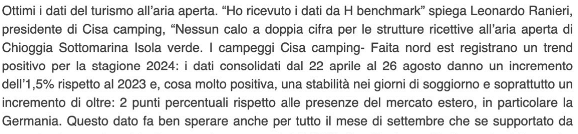 Dai dati HBenchmark si rileva un trend positivo per il turismo all’aria aperta di Chioggia, Sottomarina e Isola verde.