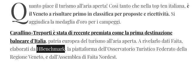 HBenchmark ha elaborato, per l’Assemblea di Faita Nordest e l’Osservatorio Turistico Federato della Regione Veneto, i dati che hanno premiato la località del Nord Est come prima per flussi turistici OpenAir.