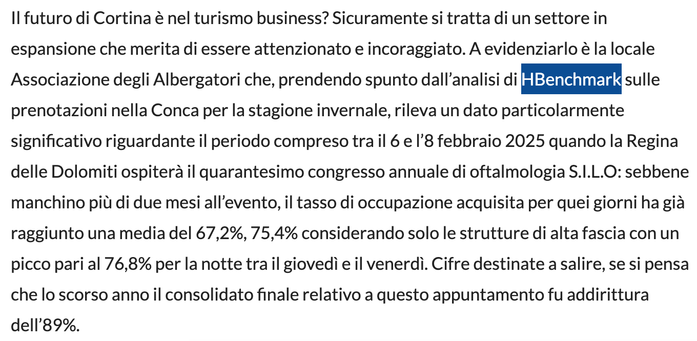 Dalle analisi di HBenchmark per l’Associazione degli Albergatori si rileva come le prenotazioni nella Conca per la stagione invernale siano in rialzo soprattutto per il congresso annuale di oftalmologia S.I.L.O che si terrà tra il 6 e l’8 Febbraio 2025.