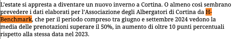 La stagione estiva 2024 nella conca ampezzana registra un +10pp di occupazione rispetto al 2023 (arrivando a oltre il 50% delle prenotazioni): il mese più richiesto per ora è giugno con il 62% di occupazione acquisita dovuto probabilmente ai diversi eventi sportivi nel territorio.