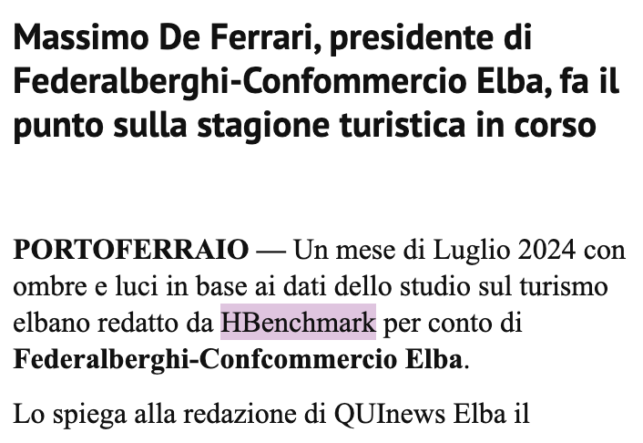 Dalle parole di Massimo De Ferrari, presidente di Federalberghi-Confommercio Elba, si evince come il mese di Luglio in base ai dati dello studio sul turismo elbano redatto da HBenchmark per conto di Federalberghi-Confcommercio Elba, abbia registrato circa 2pp in meno rispetto al 2023 dovuto in parte alla contrazione dei giorni di permanenza e la diminuzione della capacità di spesa del turista.
