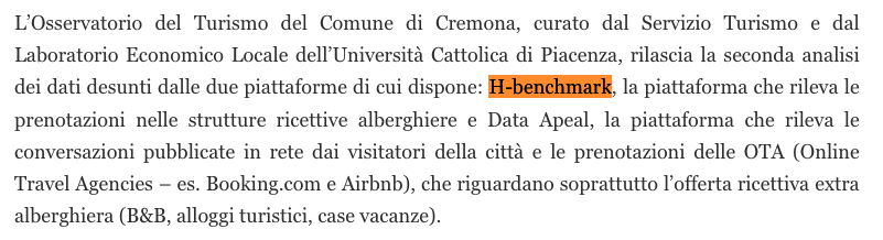 In questo contesto sono stati presentati anche i dati HBenchmark che compongono parte dell’Osservatorio Turistico del comune di Cremona.