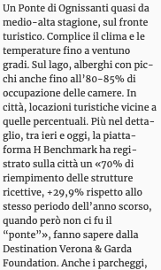 Il bel tempo ha garantito un Ponte quasi da alta stagione sia al lago che in città: il Lago di Garda registra, dai dati estrapolati da HBenchmark, picchi fino all’80% di occupazione dal 31 Ottobre al 2 Novembre 2024 e anche la città ha accolto tantissimi turisti soprattutto da francesi e spagnoli.