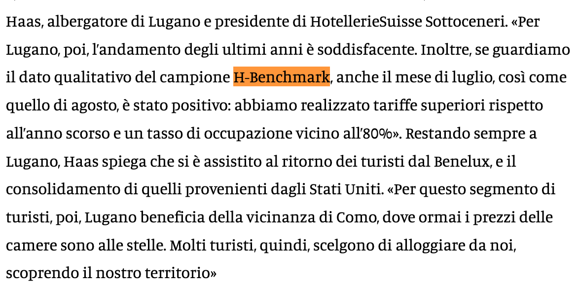 I dati di Lugano forniti da HBenchmark, dice il presidente, sono soddisfacenti: i mesi di luglio e di agosto sono stati positivi con tariffe medie superiori rispetto all’anno scorso e un tasso di occupazione vicino all’80%.