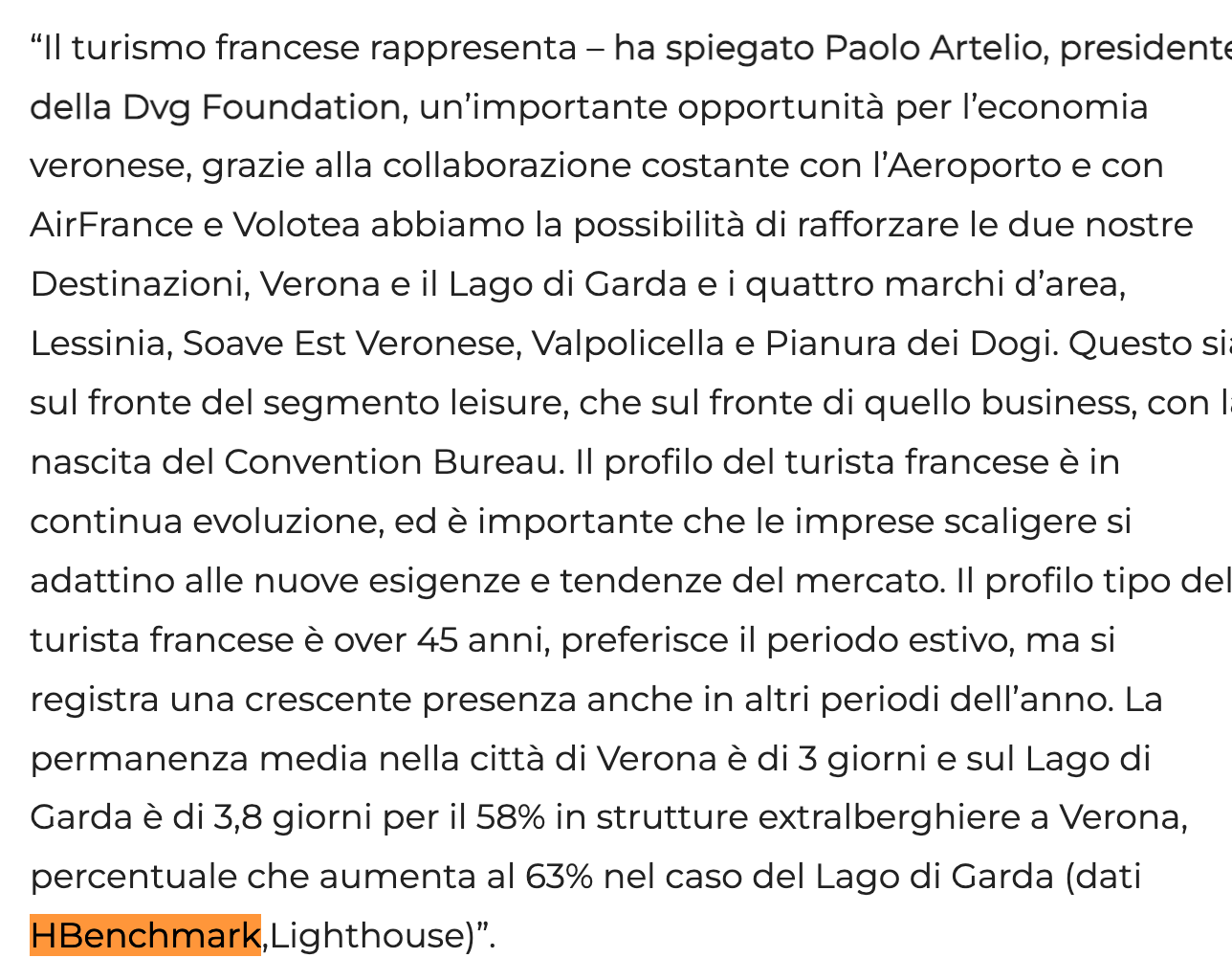Grazie all’analisi HBenchmark si è evidenziato come il mercato francese sia presente sia sul lago che sulla città di Verona con una permanenza media di circa 3 giorni nelle due destinazioni.