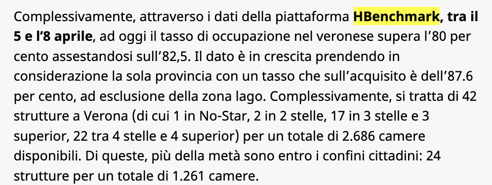 A dieci giorni dal Vinitaly 2025 i prezzi di alcuni hotel raggiungono cifre davvero molto elevate, che in alcuni casi superano i 10.000 euro per due notti. Tuttavia, accanto a queste tariffe estreme, circa cinquanta offerte si attestano tra 1.000 e 2.000 euro, con alcune soluzioni ancora disponibili a prezzi più in linea con l’alta stagione. Nel periodo tra il 5 e l’8 aprile, il tasso di occupazione alberghiera nel veronese ha superato l’80%, attestandosi all’82,5%. Nella sola provincia (esclusa la zona lago), il tasso sale all’87,6%. I dati, forniti da HBenchmark e analizzati dall’Osservatorio Turistico Verona Garda, riguardano 42 strutture a Verona, con un totale di 2.686 camere, di cui oltre la metà (1.261 camere) situate nel centro cittadino.