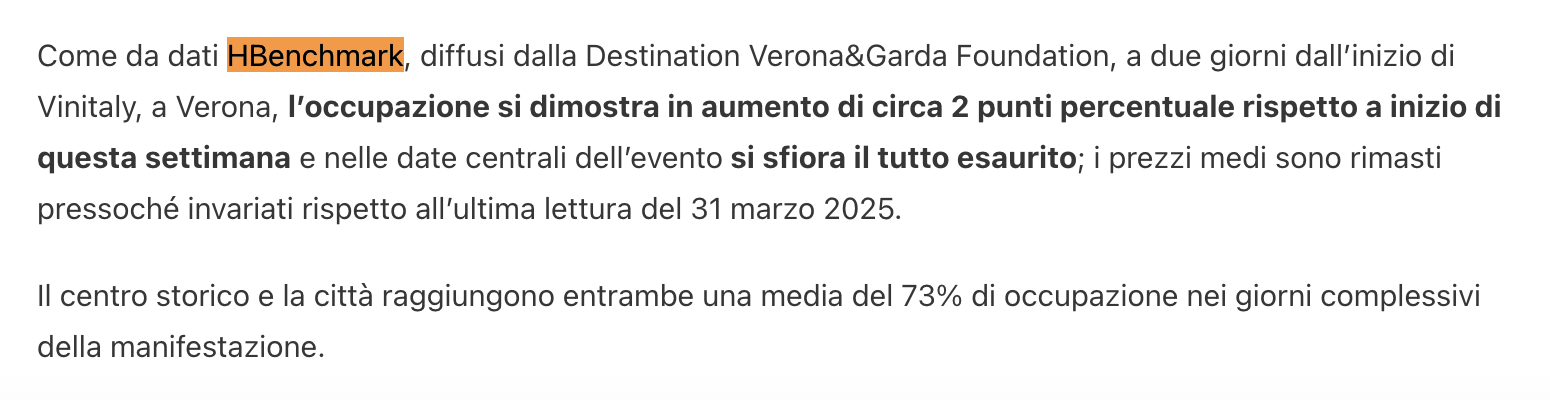 📊 I dati HBenchmark, diffusi da Destination Verona & Garda Foundation, mostrano che l’evento sta già facendo sentire il suo impatto, con un tasso medio di occupazione in città del 73% per tutto il periodo della manifestazione, in crescita di due punti percentuali rispetto all’inizio di questa settimana.‍