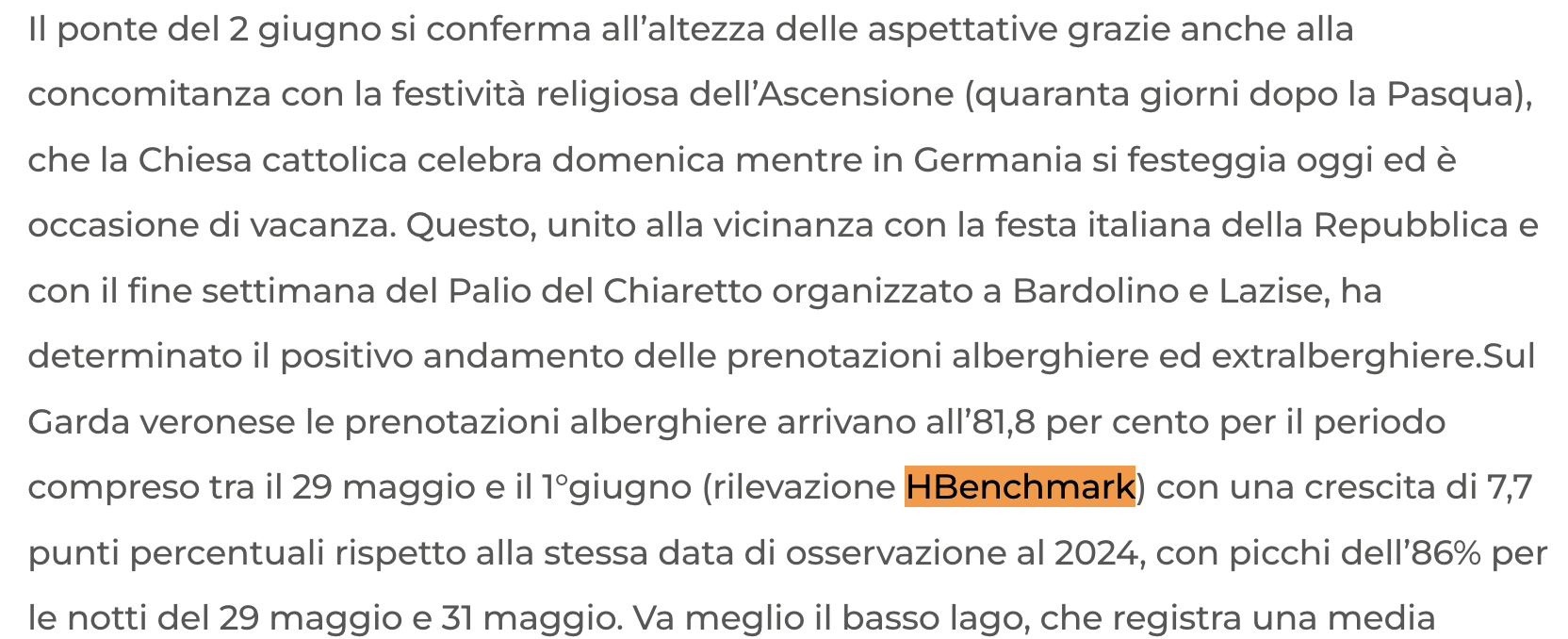 A confermarlo sono i dati elaborati da HBenchmark per Destination Verona & Garda Foundation sull’occupazione media acquisita ad oggi per i soggiorni alberghieri sulla sponda veronese del Lago di Garda nel periodo 29 maggio – 2 giugno.