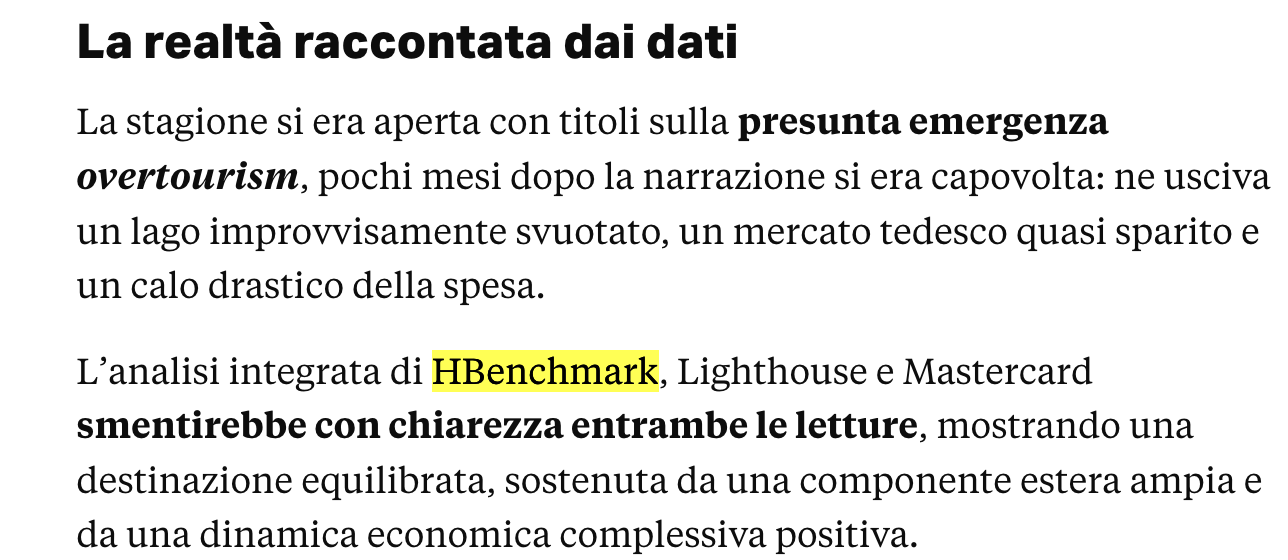 I dati di HBenchmark, forniti all’Osservatorio Turistico Verona Garda della Destination Verona & Garda Foundation assieme a quelli di Lighthouse e Mastercard, e presentati durante la conferenza stampa del 15 dicembre a Garda, restituiscono invece una fotografia molto diversa.